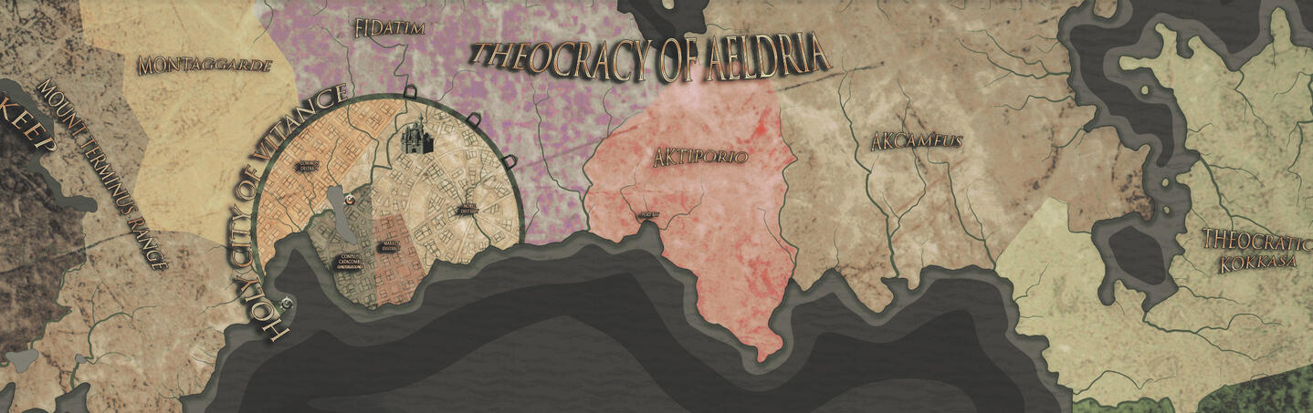 Mount Terminus Range — Technically a territory and not a city, as it is mostly uninhabited due to both harsh volcanic terrain and the rare invasion from the Rougelands, should they wish to brave it’s crossing. It serves as a protective barrier between the Theocracy and the Rougelands.Montaggarde — A rural, feudal area with fertile soil from the nearby Mt. Terminus’s volcanic ash. It has an ethnicity comparable to France, and is the ethnic homeland of Archsurgeon Frederic.The Holy City of Vitance — The capitol of Aeldria and current home to the Conplus. It has an ethnicity comparable to Rome. All of the current Archclergy reside here.Fidatim — A more suburban district closely tied with the Holy City. It has an ethnicity comparable to Italy, and is the ethnic homeland of Archteacher Fidel.Aktiporio — A bustling port city with arguably more activity than the Capitol itself. It is the center for Aeldrian trade. It has an ethnicity comparable to Greece, and is the ethnic homeland of Archcrusader LithosAkcameus — The western of two territories conquered from the Akcamuran Empire. It is poorer than the surrounding Aktiporio and Kokkasa cities, and is mostly rural. The people here are usually a mix of ethnically Aktiporian and ethnically Akcamuran, as this territory has been disputed between the two up until the recent acquisition of the Kokkasa territory.Theocratic Kokkasa — The more recent territory acquired from the Akcamuran Empire, given as part of a peace treaty. While the culture is far more Akcamuran than Theocratic Aeldrian, it remains under Theocratic rule. It has an ethnicity comparable to Turkey, and is the ethnic homeland of Archfather Zain.